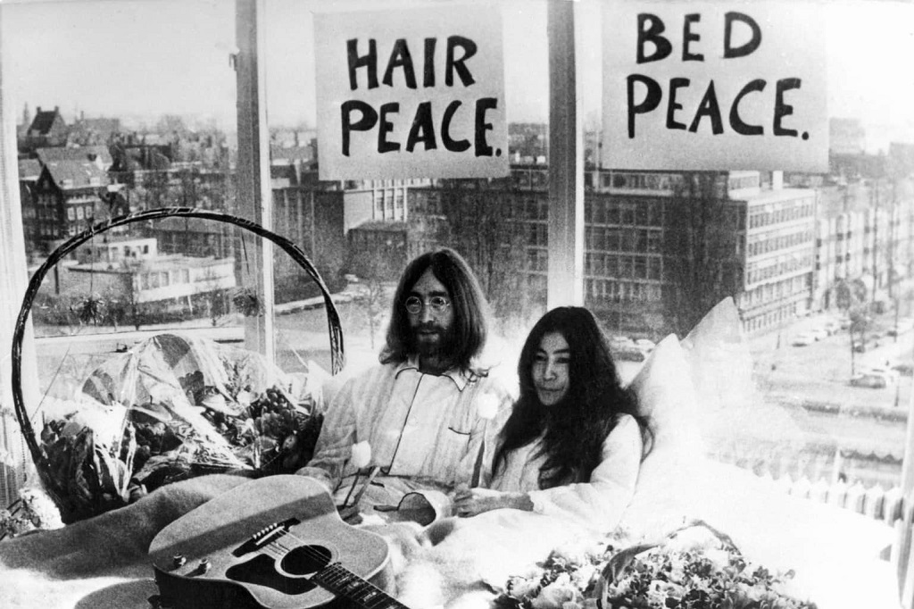 Az amszterdami Hilton szállodabeli lakosztályukból a világbékére szólítottak fel „fekvősztrájkjukkal” (bed-in), a Szeretkezz, ne háborúzz! jelmondat szellemében. Az egy hetet a pár dohányzással, evéssel, énekléssel, gitározással töltötte, miközben interjúkat adott az újságíróknak. Egy holland filmes csapat is készített felvételeket egy kétrészes, 84 perces dokumentumfilmhez – egyfajta videonaplóhoz – a pár kérésére.