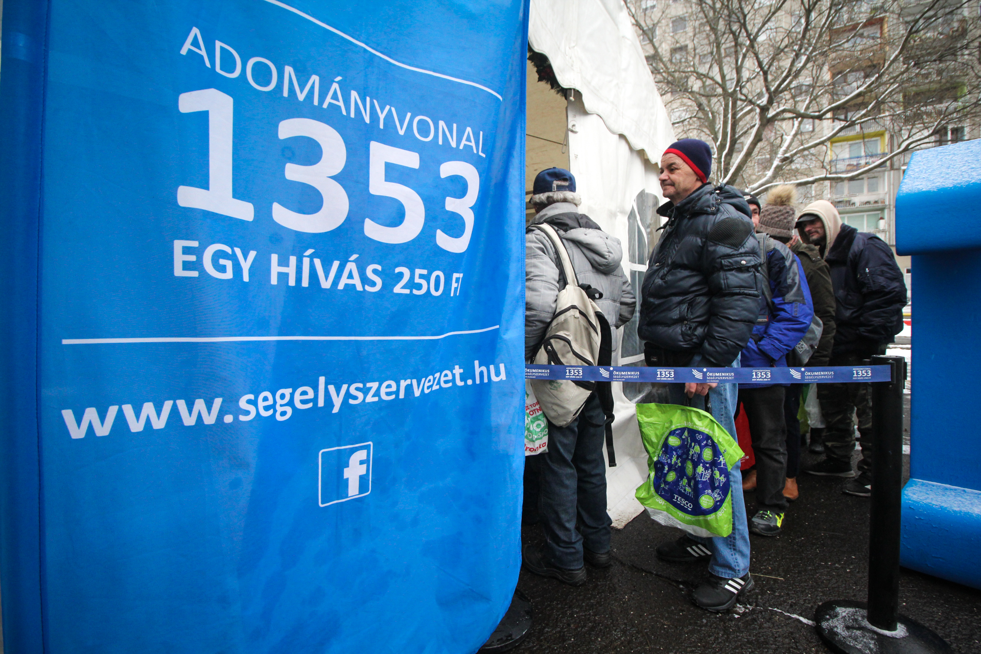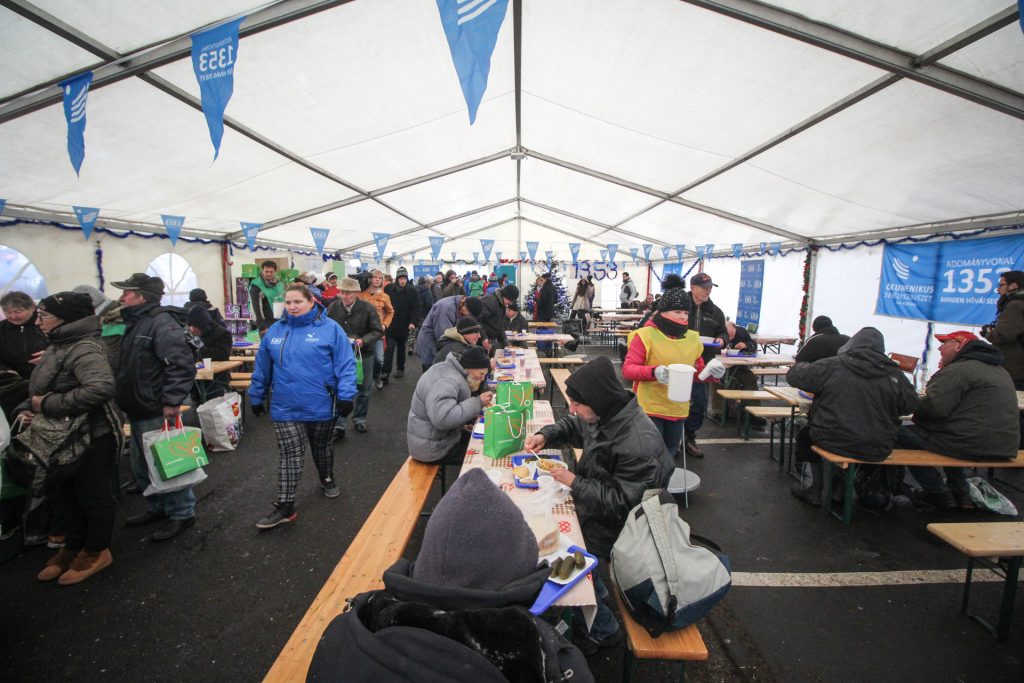 A fővárosi ételosztás kapcsolódik az Ökumenikus Segélyszervezet szeretet.éhség. Országos Adventi Pénzadománygyűjtéséhez. A karitatív szervezet ünnepi segélyakcióit és egész éves rászorulókért végzett munkáját a 1353-as adományvonal tárcsázásával, hívásonként 250 forinttal lehet támogatni!