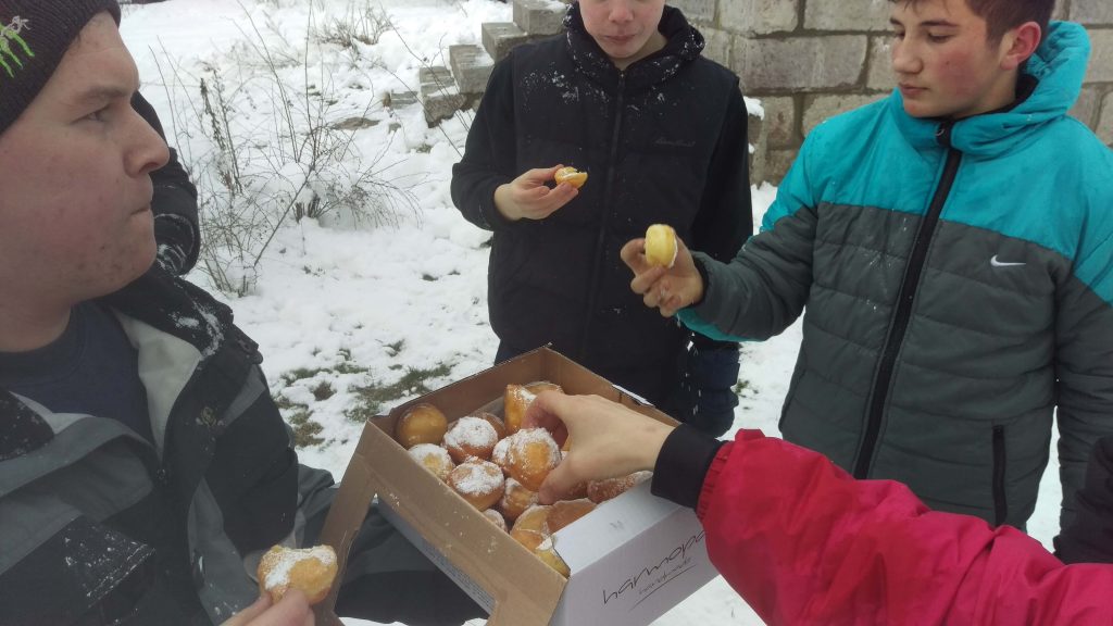 Bár sok munkával kell szembenézniük mégis jut idő az újratöltődésre amikor az anyukák által sütött finom, ínycsiklandozó fánkok illetve barátok, szomszédok által elkészített forralt bor, pálinka vagy tea kortyolgatásával pihenhetnek meg. Amint sikerül elérni az általuk kitűzött célt újból megmutatjuk önök számára , hogy milyen is lett a hét fős csapat által megálmodott hóember végeredménye.